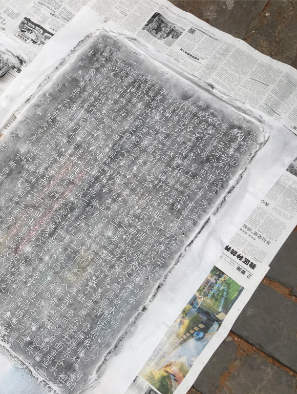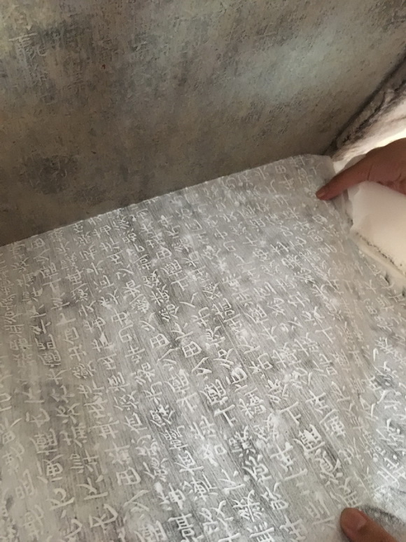 5. 上墨。待拓纸干湿度适合时方可上墨,过于干燥的话,碑、纸间易渗入空气形成气泡,导致字迹易位;过于潮湿则容易晕墨。