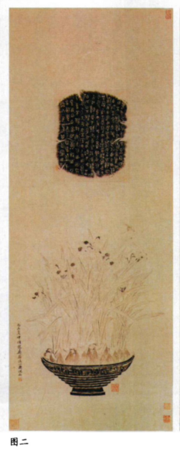 2.僧达受(1791-1858),字六舟,别号寒泉、南屏退叟等,嘉兴海昌(今属海宁)人。生平嗜金石,据其自编年谱载:“壮岁行脚所至,穷山邃谷之中,遇有摩崖必躬自拓之,或于鉴赏之家得见钟鼎彝器,亦必拓其全形。”(6)达受交际甚广,尤与阮元、何绍基、戴熙等人关系最契。曾为阮元作《百岁图》,“先以六尺匹巨幅,外廓草书一大寿字,再取金石百种捶拓,或一角,或上或下,皆不见全体著纸。须时干时湿,易至五六次,始得蒇事”(7)。阮元对此极为赏识,以“金石僧”称之,一时传为佳话。达受以擅长用淡墨著称,存世拓片尚多见。六舟全形拓还常见与绘画相结合,或以钟鼎插花作为题材,或自绘小像于其间,颇具文人情趣(图二,嘉德2000年春季艺术品拍卖会拍品)。