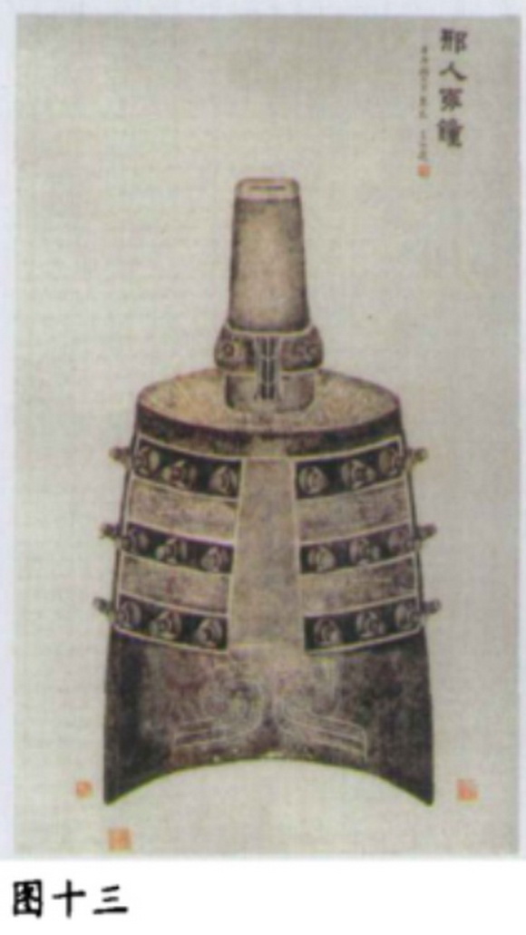 这里我们可以借此讨论一下有关全形拓本的作伪问题。全形拓本的作伪情况较为复杂,大体可分为整体作伪和部分作伪两类。整体作伪即翻刻,以上已结合相关实例有所说明。下面主要介绍一下部分作伪的情况。如图十二,者女觥全形拓本(北京大学图书馆藏),此拓初看甚精,但如此清晰的效果,似非一般墨拓所能达到。仔细观察后会发现,分布器身各处的细小窃曲纹,系经过摹描加工而成。又如图十三,井人女钟全形拓本(北京大学图书馆藏),钟枚部显然不是原拓。从原则上讲,全形拓片的各部分都应该是从原器上拓下的,否则其真实性就值得怀疑。但由于全形拓法的难度确实很大,有时拓工也实属无奈而为之。比如钟枚的捶拓,因枚部高突出于钟体,要用一张纸,在同一平面上体现出来非常困难。陈介祺《传古别录》曾有专节论述钟的拓法,其中提到“拓钟留孔不拓钲为大雅,斜贴作钲甚俗”(20)。包括陈介祺在内的各家拓片多采取留白不拓,或者涂上墨点的办法替代。笔者曾在嘉德2000年秋季拍卖会上见到一钟的全形拓本,上钤“海滨病史”藏章(陈介祺号),其枚部恰恰采用陈氏斥之“甚俗”的斜贴法,仅凭此点,似乎便可定其为伪作(图十四)。除了难拓的原因外,也存在一种情况即原器物残破,为求器形完整,而用其他办法补之的,如噩侯鼎全形拓本(图十五,中国国家图书馆藏),口沿下一周夔龙纹,显然系用墨绘补缀而成。嘉德2000年秋季拍卖会上见有同一器的全形拓本,作伪部位完全相同,估计可能是因为这一部位残蚀或破碎比较严重,难以捶拓的缘故。除了墨绘的方法外,还有剪贴它器补之的,或将素面部分在木板或砖瓦上拓就后再补上的,这里就不再详细介绍。