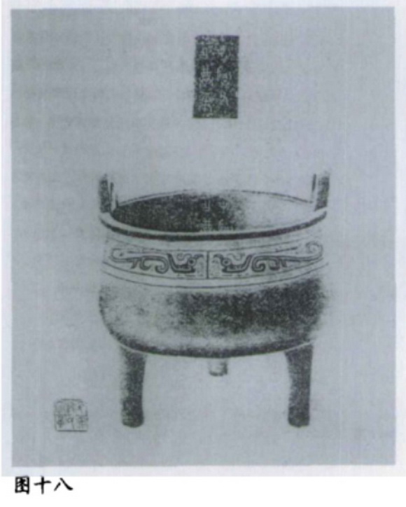 2.马子云(1903-1986),陕西郃阳人。1919年进北京琉璃厂碑帖铺庆云堂当店员,1947年受故宫博物院招聘传拓铜器碑帖,并从事金石鉴定和研究。生前曾任故宫博物院研究馆员,国家文物鉴定委员会委员。马子云先生本人曾这样回忆早年学拓全形的经历:“欲学传拓铜器之立体器形,即在各处求教,皆一一碰壁。无法,只好自己努力钻研,经过二年苦研,始能拓简单之器形。予仍继续努力掌握钻研,终于拓成一比较合理之虢季子白盘立体器形。”(23)现藏故宫博物院的虢季子白盘全形拓片正是其代表作。据弟子纪宏章先生回忆,此件作品是60年代马先生在鲁迅艺术学院的几位青年学生配合下,花了将近3个月时间才完成的。马氏全形拓的一大特色是先摄影,用放大尺依其尺寸放大,然后再施拓,与传统方法相比,拓片图像更为逼真,细部毫发毕现,令人叹为观止(图十七)。故宫博物院的纪宏章先生乃其入室弟子,也善拓全形。才兴父鼎全形拓(图十八),收录于纪宏章所著《传拓技法》一书,由于印刷质量局限,书中图片不甚清晰。笔者曾特地登门拜访过纪先生,有幸看到了原拓本。据纪先生介绍,由于拓时光线是从左前方进入,因此,器物受光部分(左侧)用淡墨拓,而背光部分(右侧)则用浓墨,但也不是单纯白和黑的对比,从左侧的淡墨到右侧的浓墨,是一个墨色的渐变过程,原拓本对这种墨色之间的过渡处理得十分自然,似乎能让人感觉到光线的流动。口沿部分,由于左耳的遮挡,因此明暗位置与腹部刚好相反,原拓本也很好地用墨色变化表现出了鼎口的纵深感,确为一件不可多得的全形拓佳作。