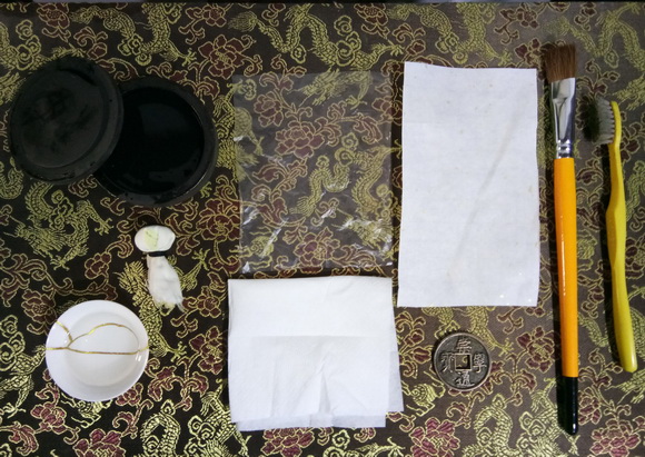 1、钱币 2、宣纸 3、卫生纸 4、墨汁 5、牙刷 6、毛刷 7、水 8、薄塑料纸 9、拓包