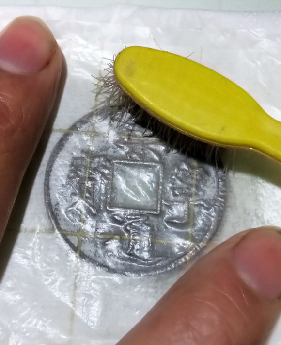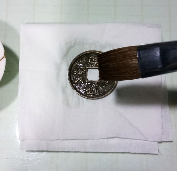 1、将钱币清理干净,放在卫生纸上,用毛刷蘸水将钱币润湿