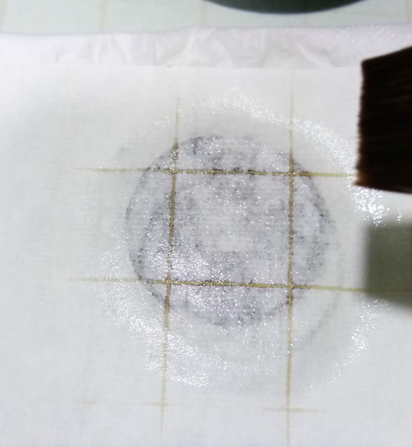 2、盖上宣纸,在用毛刷蘸水轻刷