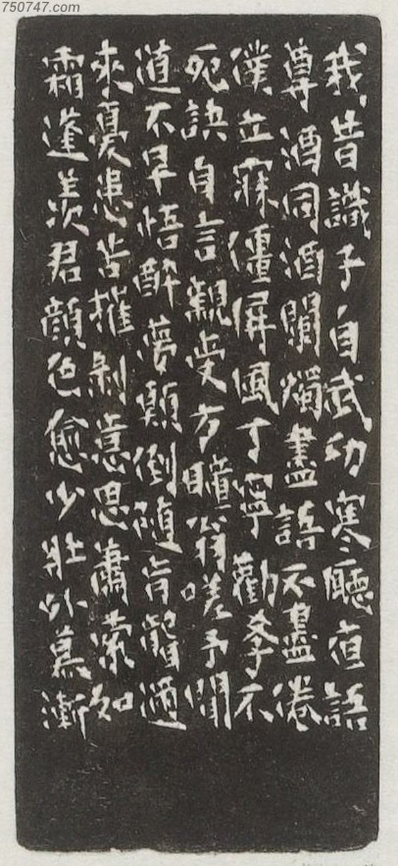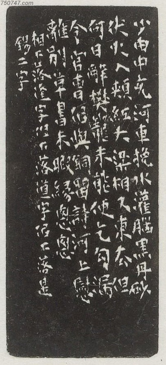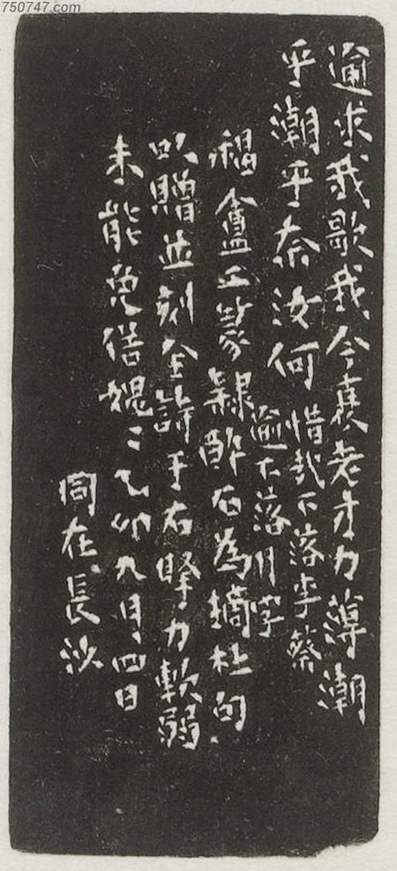 边款:1. “我昔识子自武功,寒厅夜语樽酒同。酒阑烛尽语不尽,倦仆立寐僵屏风。丁宁劝学不死诀,自言亲受方瞳翁。嗟余闻道不早悟,醉梦颠倒随盲聋。迩来忧患苦摧剥,意思萧索如霜蓬。羡君颜色愈少壮,外慕渐少由中充。河车挽水灌脑黑,丹砂伏火入颊红。大梁相(逢)又东去,但(道)何日辞樊笼。未能便乞勾漏令,官曹似(是锡)与铜。留诗河上慰离别,草书未暇缘悤悤。(相下落逢字,但下落道字,似下落是锡二字。)”张伯英工书,下笔必为楷,则号忩忩不暇草书。福盦工篆隶,近时巨擘,凡有求者,辄以转隶应,张伯英之后一人也,余为刻苏句以赠。乙卯十月,唐源邺并记。