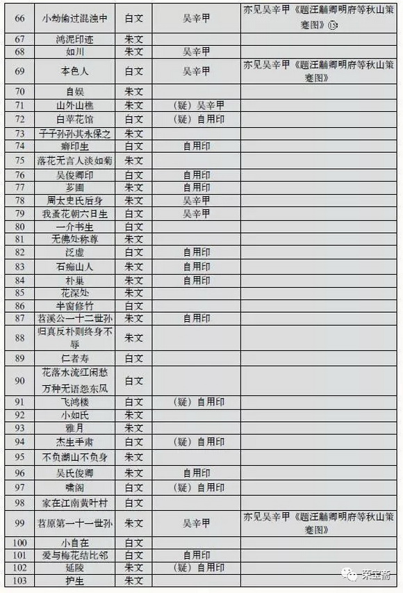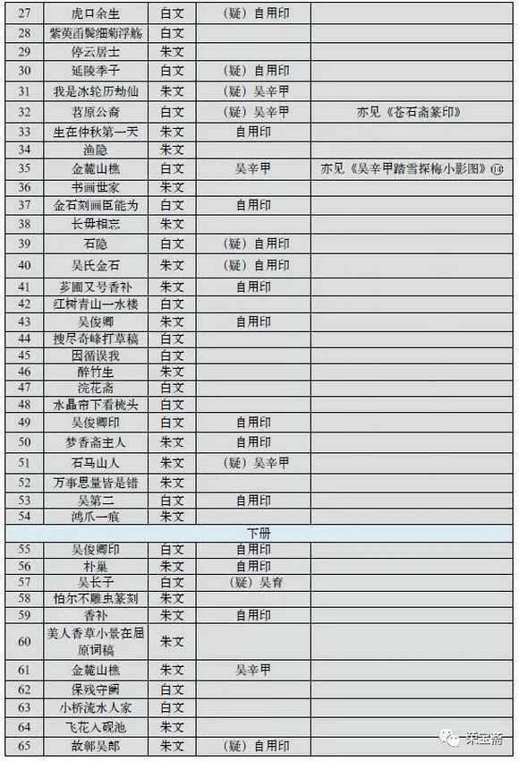 “延陵”“延陵季子”,天下吴氏出延陵,这些都是吴氏父子自用印。季子,即指季札,是春秋时吴王寿梦第四子。“苕溪公第一十二世孙”,吴昌硕自用印。“苕溪”是吴麟(一四八五——一五五三)的号,吴昌硕是其第十二世孙。“苕原公裔”“苕原第一十一世孙”,是吴辛甲之印。苕原公亦指吴麟,其著有《苕源文稿》,吴辛甲是其第十一世孙。另有“吴长子”一印,不知是否为吴育(一八七三——一八八五)之印?因吴辛甲、吴昌硕均不是长子,其家族中只有吴育可称为“吴长子”。故此印很有可能刻于吴育诞生不久,以之记事、志喜。如果推论不谬,此印的刊刻时间是同治癸酉(一八七三)八月十七日前后。“吴氏金石”“石痴”“石痴山人”“石隐”“痴印生”“金石刻画臣能为”,吴昌硕从小喜欢金石篆刻,故有这些小印,志其趣也。“朴巢”,芜园内吴昌硕的斋号名也。吴昌硕《芜园记》云:“朴巢之东,隙地三亩,草色青黄,与时枯荣,缭以周垣,强名曰园。”“芗圃”“香补”“芗圃泼墨”“芗圃又号香补”“梦香斋主人”“爱与梅花结邻”“梅花主人”,这些吴昌硕的自用印均与梅花有关。芜园内所植梅花甚多,据吴昌硕自云有三十六株之多。吴氏由此化出与之相关的一些别号、斋号。“飞鸿楼”,喻其四处奔波,了如飞鸿也。“白苹花馆”,苕溪两岸多芦苇,故吴昌硕有此斋号。“听蕉吟馆”,吴昌硕早年耽于诗,且芜园内又植有芭蕉,故有此斋号。“金钟玉磬山房”,是指安吉县城(今安城镇)附近的金钟、玉磬二山,吴昌氏早年以此为斋号。其挚友施浴升则以金钟为斋号,故其诗文集曰《金钟山房文集》《金钟山房诗集》。“虎口余生”,太平天国战争期间,吴昌硕在逃难途中遇到老虎,竟然得以全身而退,故有此印纪事也。“生在仲秋第一天”,即指八月初一,此日正是吴昌硕的生日。“吴第二”,也当时吴昌硕自用印,吴昌硕在弟兄三人中排行第二,其长兄、季弟均死于天平天国战争中。“泛虚”“泛虚室主人”,也是吴昌硕的斋号。其“心田存一点”一印款云:“时辛未(一八七一)夏六月,作于泛虚室。”另外“啸阁”“杰生小像”“杰生手肃”等印,也应该是吴昌硕早年自用印,或为斋号或为别号,中年以后即弃之不用矣。