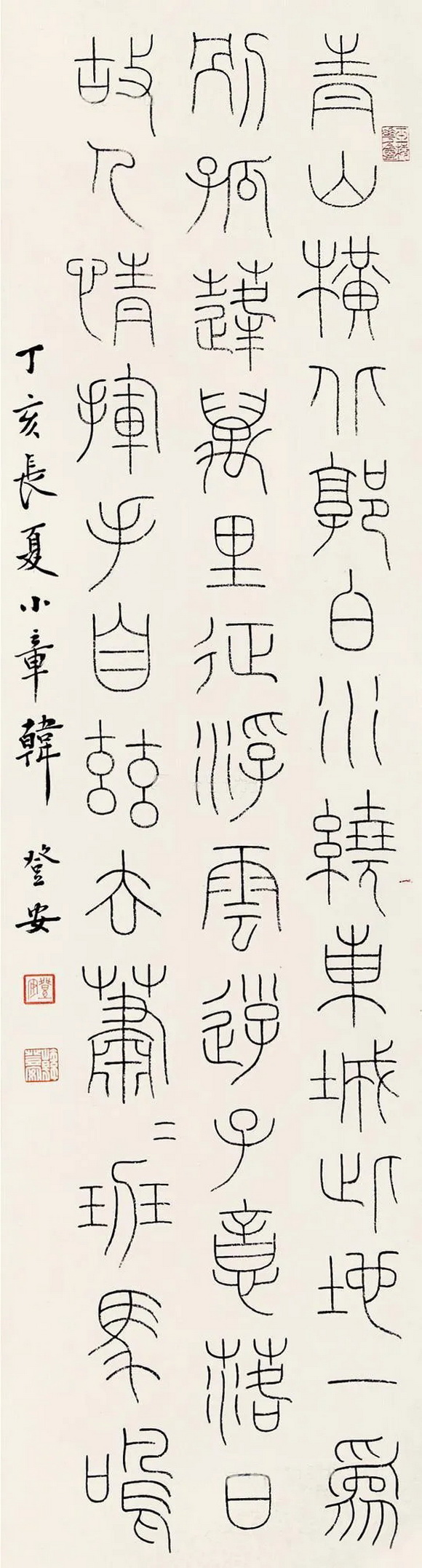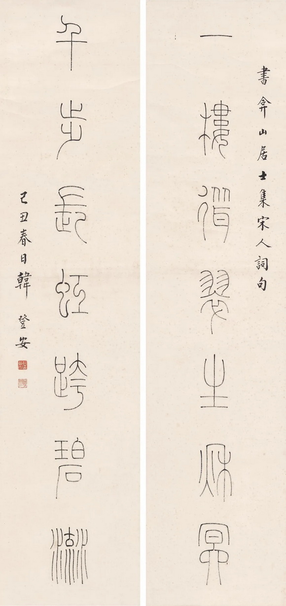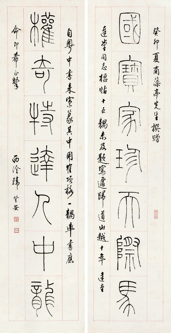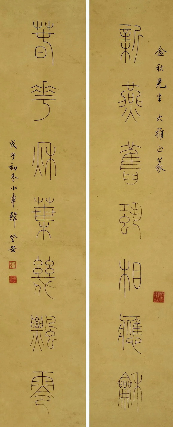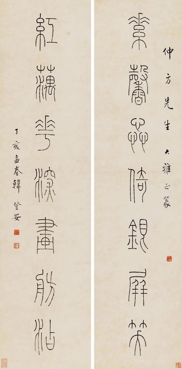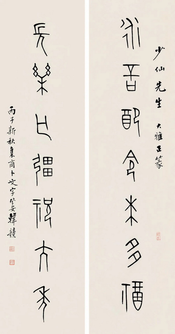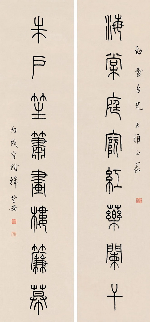以玉筋篆著名的韩登安,篆书楹联赏,秀润挺劲匀整劲丽 △国宝家珍天际马,权奇特达人中龙。 △素馨蕊倚银屏笑,红藕花深画舫沾。 △青山横北郭,白水绕东城。此地一为别,孤蓬万里征。浮云游子意,落日故人情。挥手自兹去,萧萧班马鸣。 △新燕旧蛩相应龢,春花秋叶几飘零。 △一楼耸翠生秋冥,千步长虹跨碧流。 △永言配命求多福,长乐无疆祝大年。 △海棠庭院红药栏干,朱户笙箫画楼帘幕。 页码: 页 1, 页 2 印谱.教程.技法 - 分享 加微信获取:wenbaozhai365
