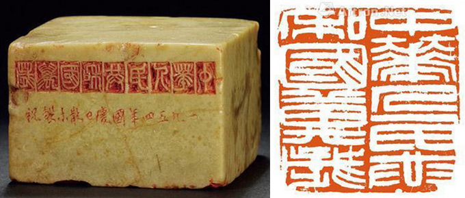 邓散木刻青田石印章,中华人民共和国万岁,1954年制 邓散木(1898~1963),原名铁,学名士杰,字钝铁,别号且渠子、一夔、一足等,斋名厕简楼、豹皮室等。生于上海,在艺坛上有“北齐(白石)南邓”之誉。擅书法篆刻,真、行、草、篆、隶各体皆精。 印文:中华人民共和国万岁 作者:邓散木 年代:1954年作 来源: 尺寸:7.7×7.4×5 cm 边款:一九五四年国庆日散木制祝。 材质:青田石 成交价:184000 (西泠印社2018年春拍) 印谱.教程.技法 - 分享 加微信获取:wenbaozhai365