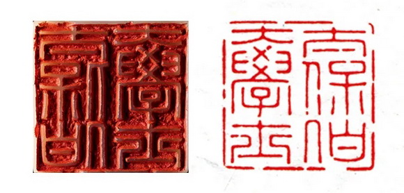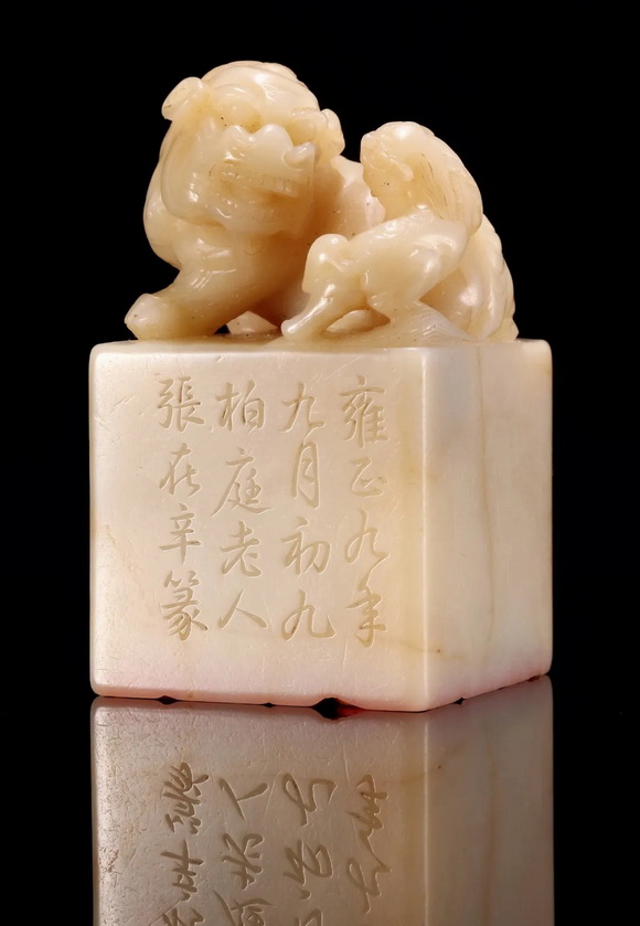 印亦为芙蓉石,圆雕太狮少狮钮,造形威猛、气度不凡,所具包浆非历百年不可为之。所刻印文以秦汉铸印为范,工致浑朴然不失金石韵味,长短错综,参伍取便,不排挤、不局促,顺其自然之势,得其天然之妙。从此印署款可知,辛亥重阳为雍正九年九月初九,是日适逢张廷玉六十寿诞,故此印当为彼时之寿礼。