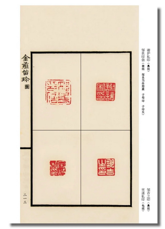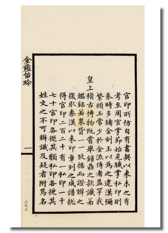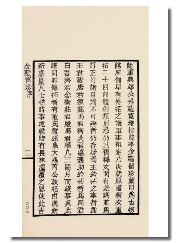 1926年6月,新成立的古物馆以原印钤制《金薤留真》24部,钤制者为王禔、唐源邺、马衡、吴瀛等,后又制成20部,传世有44部。彼时售价奇昂,后由美国庚子退款资助印行了石印本的《金薤留珍》,版式改为每页4印。