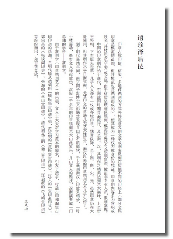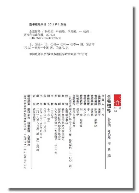 金薤留珍,钟妙明、叶伯瑜、李兵编,西泠印社出版社2019年8月据张鲁庵捐赠24册原钤本影印出版。《金薤留珍》是清宫收藏古玺印较大的一宗,其整理始于乾隆二年 (1737),乾隆十六年 (1751)完成。收印1291方 (官印221方,私印1070方),实物现藏台北故宫博物院。