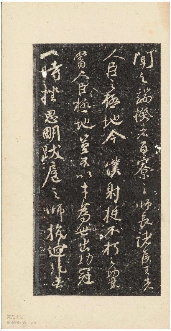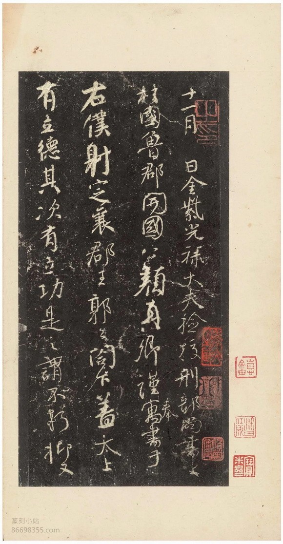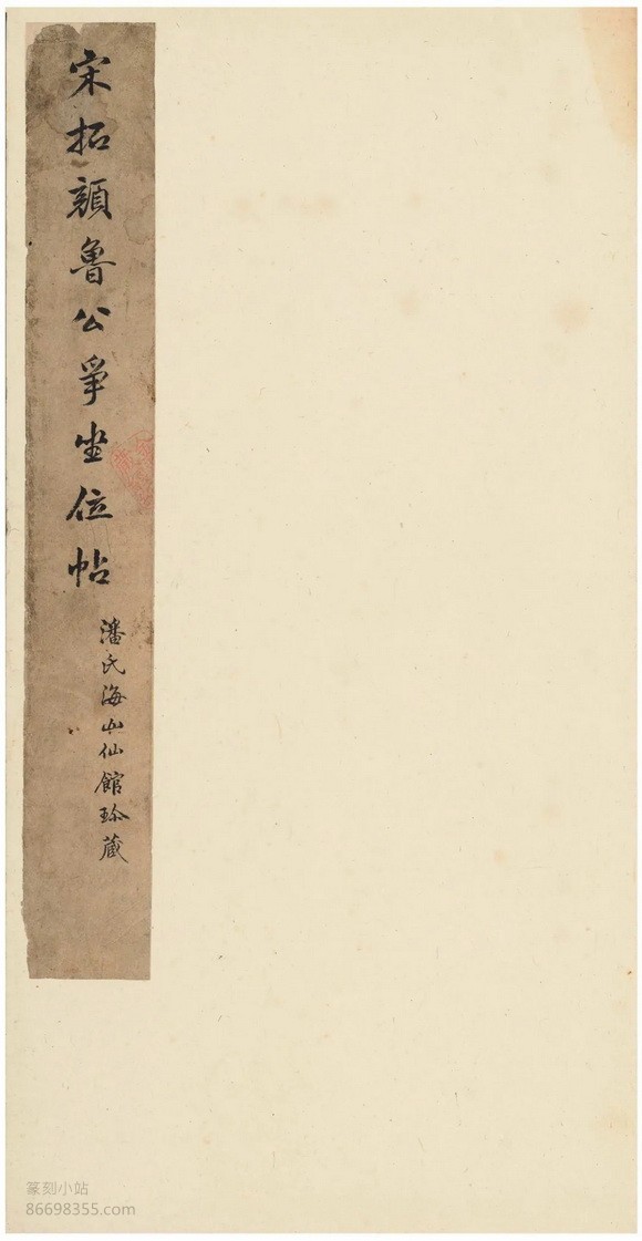 国家图书馆藏本一册,凡10.5开,其中墨本7开,题跋3.5开。第五十三行“出入王命”之“出”字笔划完好。宋元明何人收藏已无从考,清初为程瑶田家藏,后归吴荣光,后再归海山仙馆主人潘仕成,清末民初归庞芝阁,再归梁启超饮冰室,最后入藏国家图书馆。外签为梁启超乙丑正月正书所题:“程易畴吴荷屋旧藏宋拓争座位帖,今归饮冰室。”下钤“饮冰室”小椭圆印。内签为潘仕成正书“宋拓颜鲁公争座位帖,潘氏海山仙馆珍藏”,有程瑶田乙丑(1805)七月初十日一跋、翁方纲嘉庆乙丑(1805)冬十一月一跋、郑孝胥丁未(1907)五月一跋、梁启超乙丑(1925)正月两跋。钤“程氏瑶田”“吴氏荷屋平生真赏”“海山仙馆主人”“饮冰室”“庞芝阁金石文字记”等印。