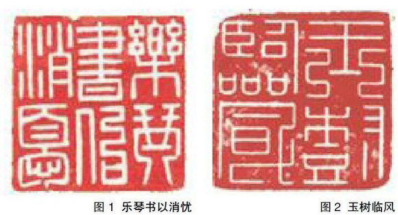 “乐琴书以消忧”(图1)和“玉树临风”(图2)都是整方印大面积留红,文字之间以及各笔画之间距离比较疏朗,文字成方,印文线条较为细劲和硬挺,转折方折气息板正,简洁劲拔。“乐琴书以消忧”整体分布比较均匀,六个字大小差不多,方方正正的排列很有汉印的传统风格,留红处也均匀分布,印章线条比较倾斜,不是直来直去的,不会显得那么刻板,比较灵活。“乐”字和“琴”字的字形处理都是上紧下松,尤其是“乐”字,上面的笔画较多,更紧凑一些,下面留红出来更显得整个字精神饱满,有种站立起来的感觉。整方印的笔画各个部分都显得修长优美,有轻重之分,使得印面有一种灵动之美,并且边缘保留完整,使得整方印章汉印韵味十足,是很传统的白细文印章。