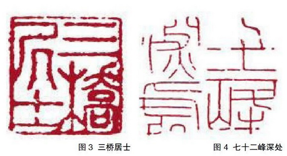 “三桥居士”(图3)和“七十二峰深处”(图4)两方朱文印章是文彭朱文印中的一小部分,他的大部分朱文印还是承袭了赵孟頫所创“圆朱文”的风格风貌。对于文彭这一类风格的作品,可以从字法和章法来进行赏析和探讨。图3“三桥居士”从整体可看出文字保留了篆法,使得印面保持平稳和谐,其“桥”字和“居”字整体字形拉长,占用的空间稍大,为合理安排印面的空间,其“三”字和“士”字笔画稀疏,占用空间比较少,相应地收缩压扁,减少不必要的空间,使得印面看起来舒适得当,增加美感。这样安排布局合理,对角相互呼应,线条粗细不均较为硬朗,开头结尾收笔之处比较圆润,没有尖细的收尾,有明显的轻重之分显出拙朴之趣,笔画转折之处比较圆转,没有那么僵硬,委婉流畅,篆法圆滑,尤其是“居”字两边圆滑的弧线笔画使得整个印面风趣灵动,“桥”字笔画多,显得比较密,而其他三个字笔画少,显得稀疏,正好是“一密三疏”,使得印面气息融会贯通,非常流畅。印面四个字的笔画与边框几乎成一条线,营造出一种若即若离的风貌,使得印面委婉流畅。