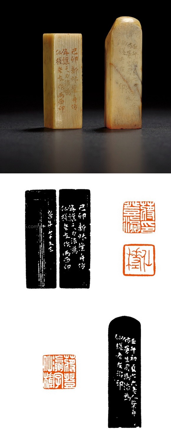 边款: 1.己卯新秋叶舟彷吴让之刀法,为仙槎老友作两面印,时七十又三。 2.壬午初夏七六老人叶舟,彷曼生司马法,为仙槎老友治印。