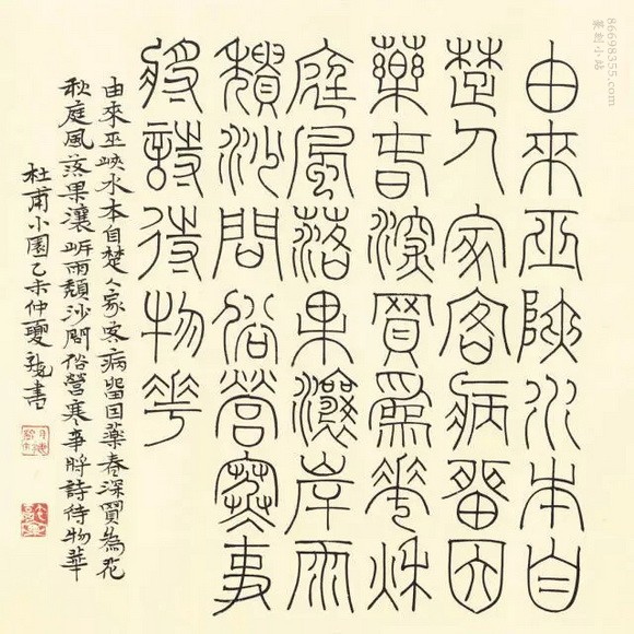 尹海龙的书法一如他的篆刻,不求怪,不张扬,有含量,耐品味,不激不厉,韵味悠长。其篆书在技术成面的功力和艺术层面的表现力都已与大他10岁的同乡刘彦湖不分伯仲,而且还有出蓝之势。“如果将陈国斌比作巫师跳神,装神弄鬼,那尹海龙就像David(魔术师),穿墙越壁,让人好生惊叹。” 石开先生说的是他的印章,他的书法又何尝不是如此呢?