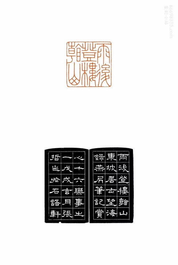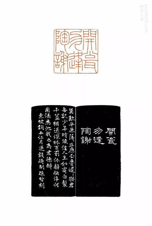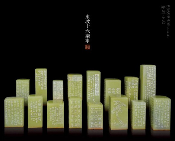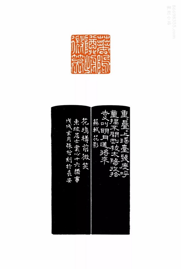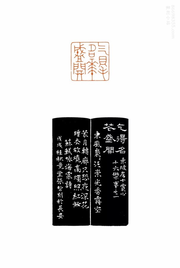 重重叠叠上瑶台,几度呼童扫不开。刚被太阳收拾去,又叫明月送将来。苏轼《花影》。花坞樽前微笑。东坡居士赏心十六乐事。戊戌玄月,张哲刻于长安。
