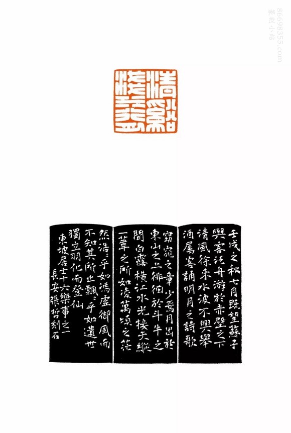 壬戌之秋,七月既望,苏子与客泛舟游于赤壁之下。清风徐来,水波不兴。举酒属客,诵明月之诗,歌窈窕之章。少焉,月出于东山之上,徘徊于斗牛之间。白露横江,水光接天。纵一苇之所如,凌万顷之茫然。浩浩乎如冯虚御风,而不知其所止;飘飘乎如遗世独立,羽化而登仙。东坡居士十六乐事之一。长安张哲刻石。