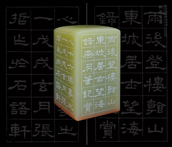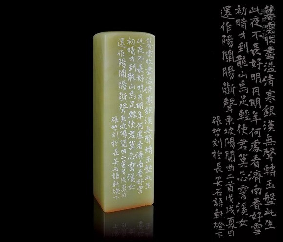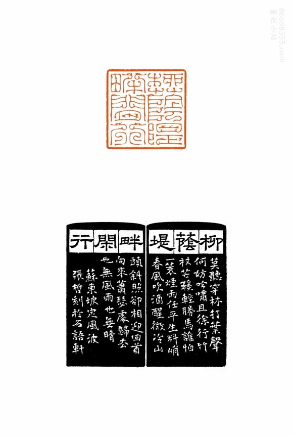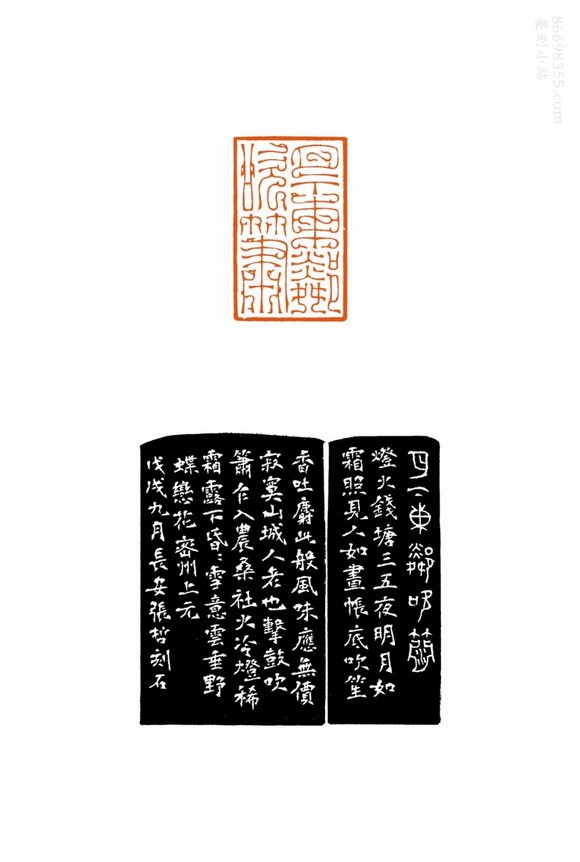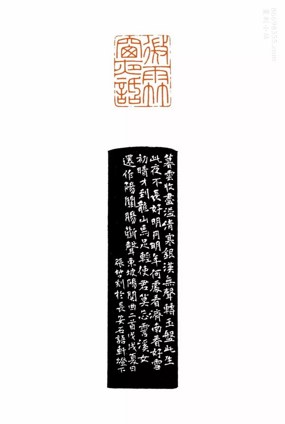 暮云收尽溢清寒,银汉无声转玉盘。此生此夜不长好,明月明年何处看。济南春好雪初晴。才到龙山马足轻。使君莫忘霅溪女,还作阳关肠断声。东坡《阳关曲》二首。戊戌夏日,张哲刻于长安石语轩灯下。
