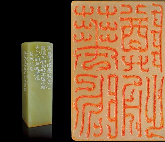 乞得名花盛开。东坡居士赏心十六乐事之一。东风袅袅泛崇光,香雾空蒙月转廊。只恐夜深花睡去,故烧高烛照红妆。苏轼《咏海棠诗》。戊戌桂秋,竟堂张哲刻于长安。
