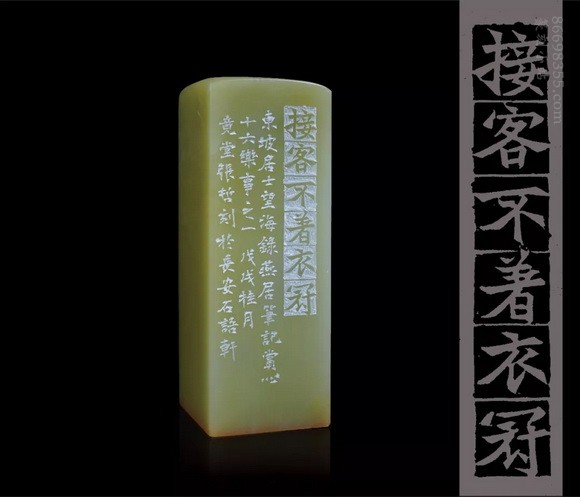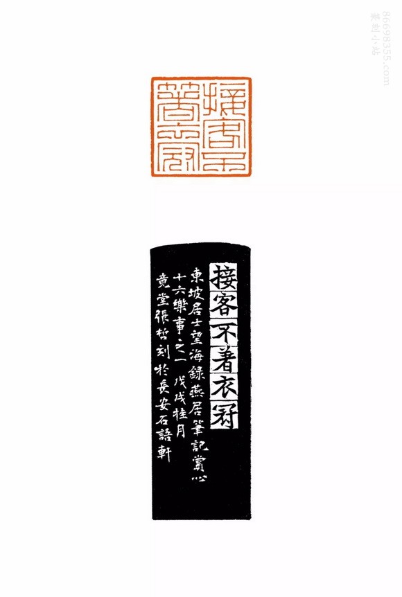 接客不着衣冠。东坡居士《望海録·燕居笔记》赏心十六乐事之一。戊戌桂月,竟堂张哲刻于长安石语轩。