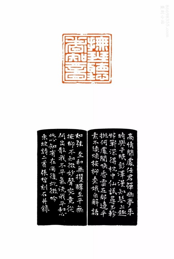 高情闲处任君弹,幽梦来时与子眠。彭泽漫知琴上趣,邯郸深得枕中仙。试寻玉轸抛何处,闲唤香云在那边。平素不须烦按抑,秦娥自解语如弦。至和无攫醳,至平无按抑。不知微妙声,究竟从何出。散我不平气,洗我平和心。此心知有在,尚复此微吟。东坡诗二首。张哲刻石并録。