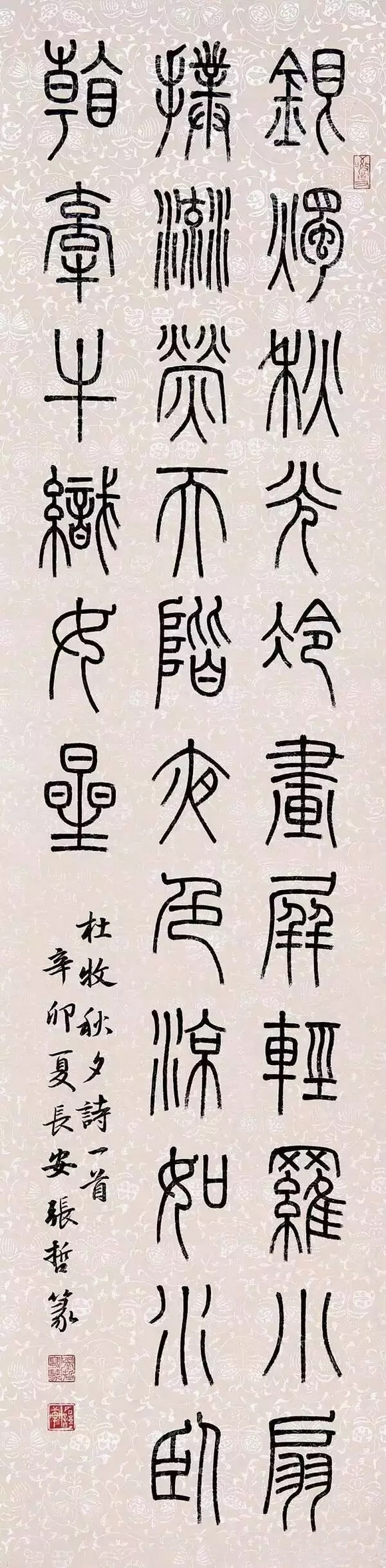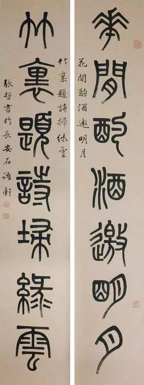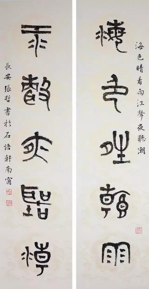 张哲尚年轻,却能如此老道,在当下书法篆刻界是不多见的。我觉着张哲像古代的隐士或老僧在石窟和禅房中吞吐出精神道场。这种优雅自在的生命情韵,贯注于他人生的将来进行时,那必是一番洁净高华、澄明晶莹的清妙境界。