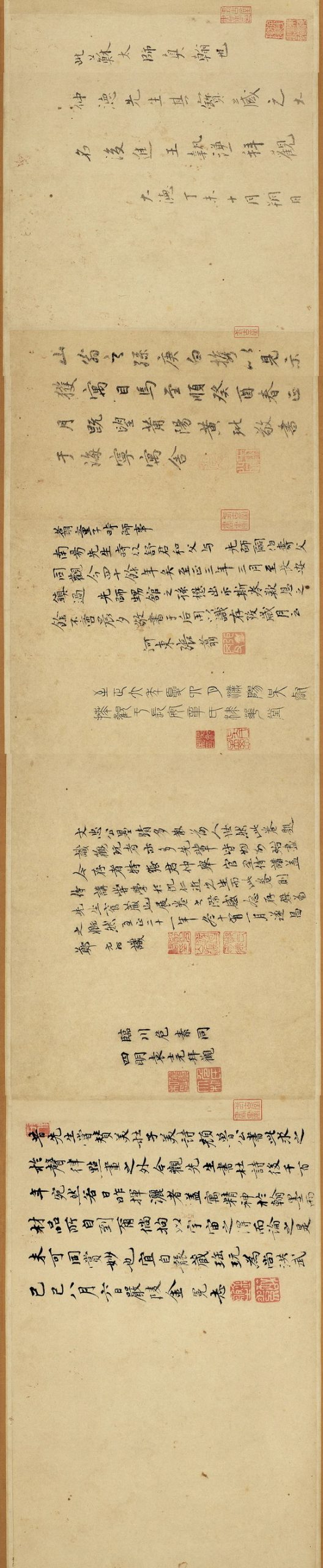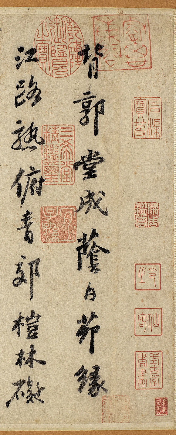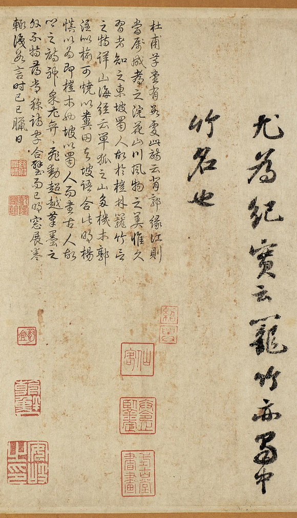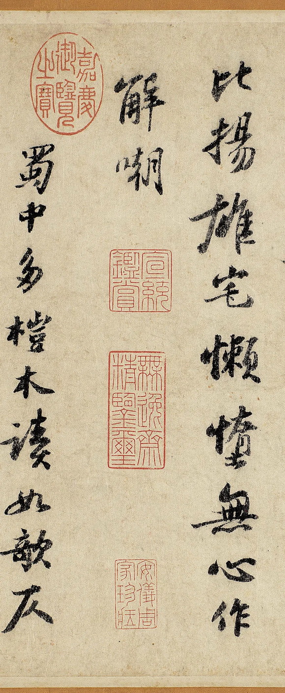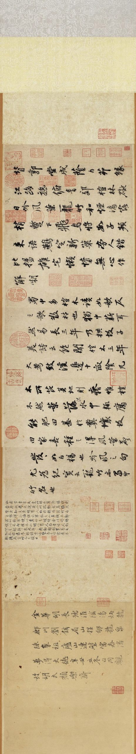 苏轼行书墨迹赏析《杜甫桤木诗卷帖》又称《书杜工部桤木诗卷帖》。澄心堂纸本,十九行,一百五十九字,全卷27.9X287.94厘米。原台北兰千山馆藏,现寄藏台北故宮博物院。