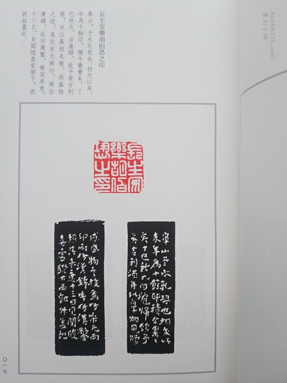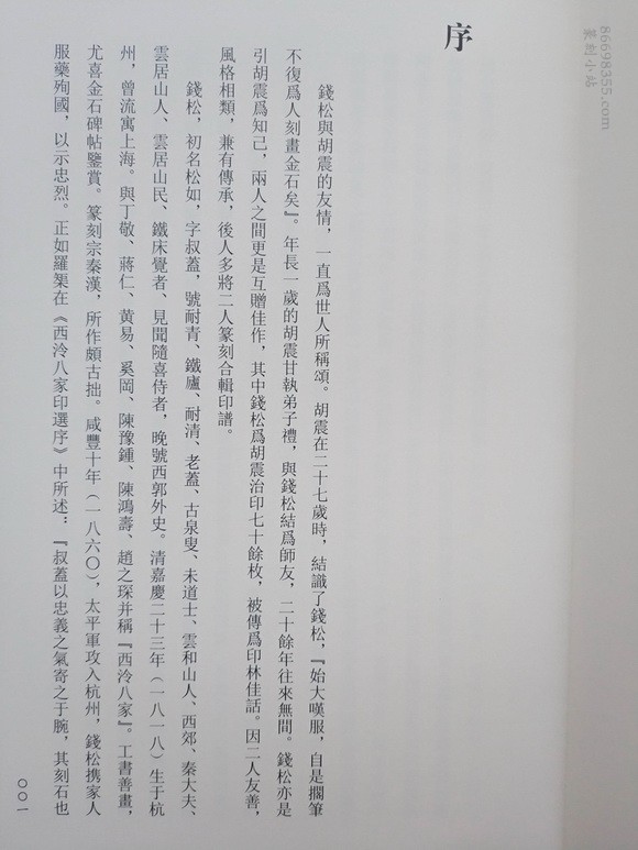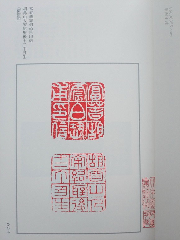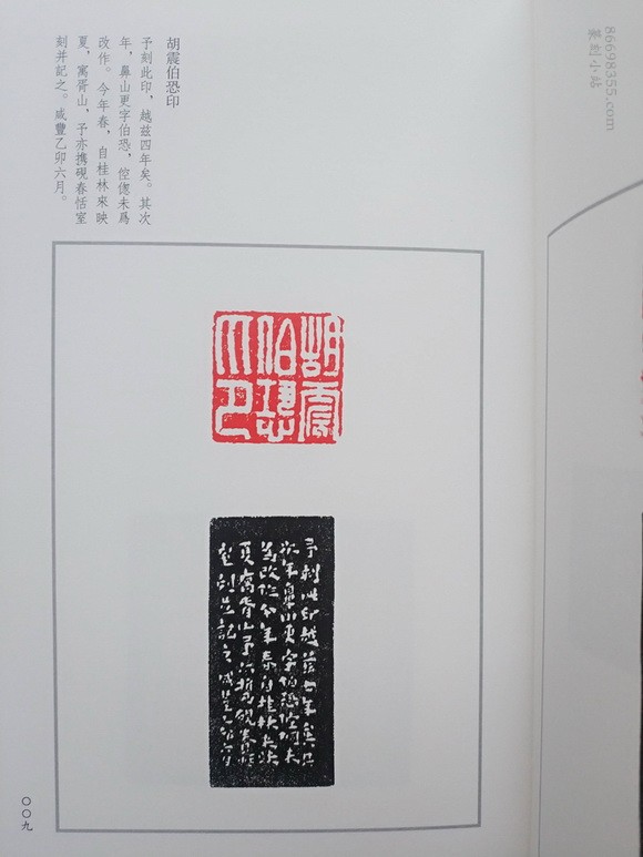 余与富阳胡伯恐交最早。其生平所诣,书法第一,铁笔次之,日夜攻苦,手不停挥,而目无余子。初未见所许可也。游杭久,时杭人铁笔,唯徐君问蘧、赵君次闲,啧啧人口。君虽推为老辈,尝谓鲜惬心之作。道光甲辰、乙巳间,见钱君叔盖所作,始大叹服,自是阁笔不复为人刻画金石矣。叔盖为君刻印至夥,先后百余石,君藏之如拱璧。以余不解此,然秋灯展匣,春雨摹笺时,亦未尝不一一举视,为余言其用腕之雄,运气之浑,直造汉人,酒酣耳热,辄复拍案狂呼,以为真不可及。今伯恐归道山三年矣,字迹留传不多,所藏叔盖印章,尚存数十。严君根复从粤来,不远数千里,搜其遗箧,并假余私印,为叔盖所作,及伯恐自为人刻,共百余石,拓印成帙,分赠知交。重叔盖之印不实,痛伯恐早世,欲永其名,而与叔盖之印并垂不朽也。乃以伯恐所遗余处诸石,尽归根复,丹泥素纸,瑟瑟蓬窗,伯恐有灵,或尚为之开卷流连,不忍释手耶?