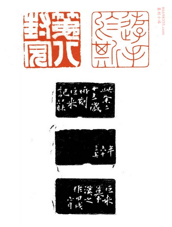 边款:巨来摹汉之作,甲戌正月。此余二十三岁所刻,巨来记,丁未六月,年六十三矣。