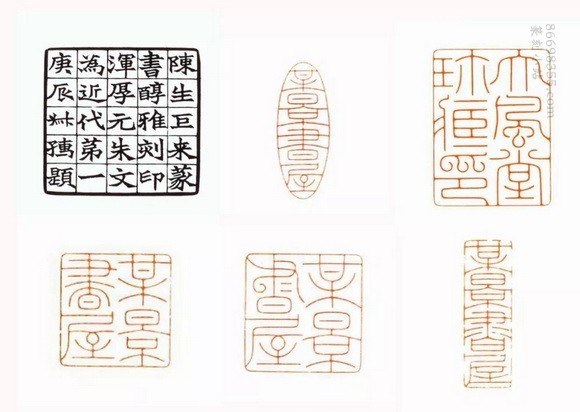 在刻制印章之前,往往要设计文字内容,此之谓“打印稿”。不过,就印风而论,大体可分“工细”与“写意”两类,而尤其前者,宜于刊刻之前将印稿设计完好并较为清晰地将其渡越至印面之上。陈巨来的治印生涯长达六十余年,不仅给我们留下了逾万方精品力作,而且还将“刻制竣工”了的众多倾心设计的印稿保存了下来,“其章法的妥帖,篆写的严谨,遗存数量之多,令人叹为观止”,凡三类:圆朱文、阔边朱文和白文。[4]前言:1-4特别将这些弥足珍贵的“治印墨稿”与镌刻成功的诸印章比较对勘,至少彰显出如此几点价值意义:第一,“印稿”的成功设计,于篆刻创作而言作用非同小可,成功的“治印墨稿”,于工整精细一路作品之创作首先意味着相当层面的成功,必须高度重视;陈巨来“治印墨稿”,分明透射出其文人的高度修养和艺术审美之非凡品位,不仅可见其文字学上的深湛功夫,亦可见其印学史乃至书法史上的深刻积淀,而刻制完成的印章,使浓郁的“书卷气”有了附丽之物,并因“工”平添了“金石味”,显著地拉开了与一般庸工的距离;“篆刻”,顾名思义,先篆后刻,尽管于“篆”与“刻”两者关系或重要性的认识不尽一致,但仍然可以说,“篆”的确是第一位的,我们从陈巨来的“治印墨稿”到“印面”生成,既可见二者的一致性,亦可见传统篆书笔墨功夫的深厚对于“用字”和“配篆”乃至整个篆刻气韵的生动实现所具有的至大支撑作用。