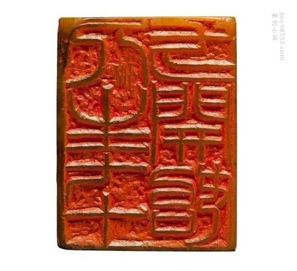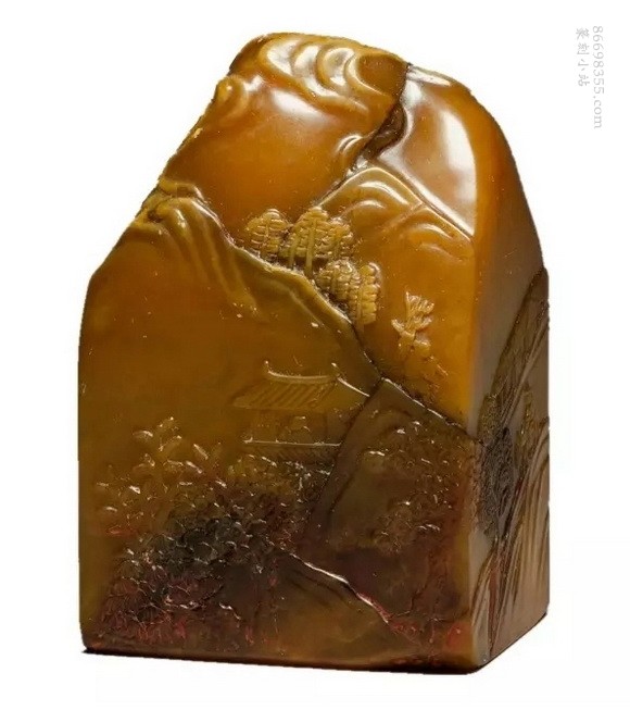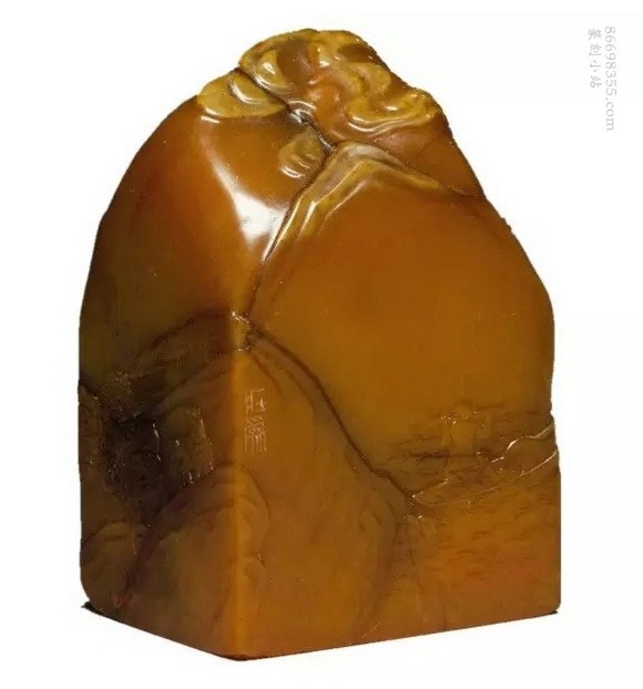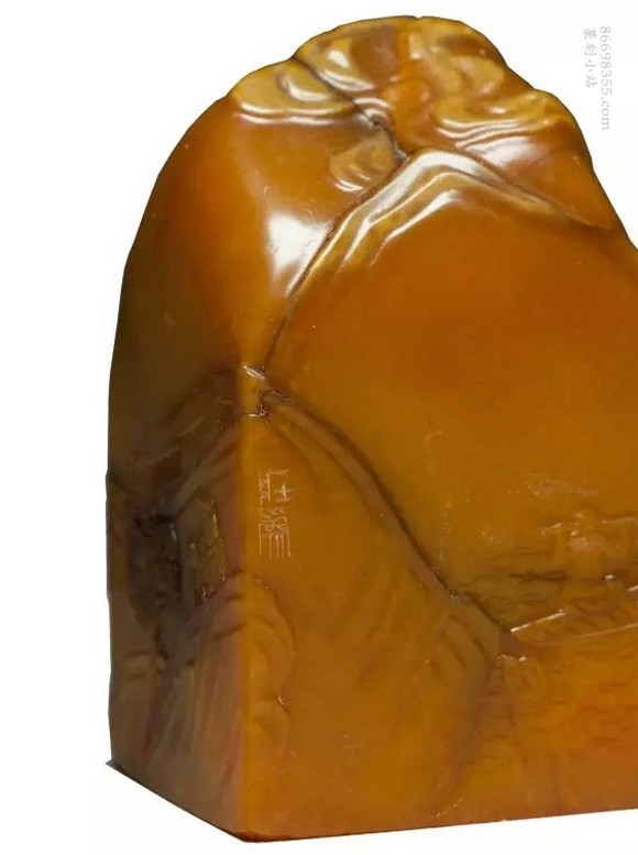 王壮为刻张群自用寿山田黄石薄意印章,印面:人生七十方开始;印面尺寸:4.2×3.2厘米,高6.3厘米,重量:176.4克,中国嘉德2017年春季拍卖会,成交价格437万元。