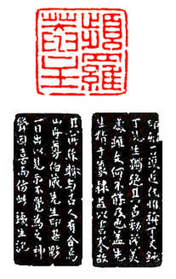 奚冈的传世名印,青田石素章,印文:菴罗菴主;印面尺寸:2.5×2.5厘米,高3厘米,边款:铁生为迈菴仿汉玉印。中国嘉德2013秋季拍卖会,成交价310.5万元。此印白文印,参汉玉印法,自然流畅,气度从容,两个“菴”字虽有大小欹侧之变,但仍和谐而无突兀之憾,为奚冈的传世名印。