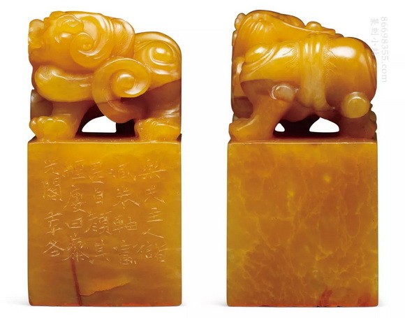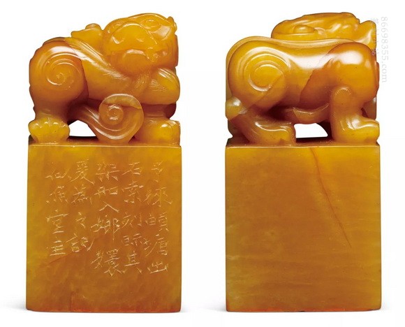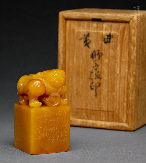 徐三庚刻寿山田黄石蟠螭钮章,此件寿山田黄石蟠螭钮方章,通体色呈深熟栗,包浆莹润,古光可照。质地凝结,萝卜丝纹缕缕散布于印身,偶见红筋。印身光素,钮雕一古兽回首矗立,古兽四足粗壮,线条劲健圆润,造型古拙憨厚。
