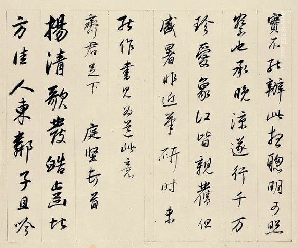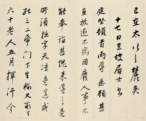 (五)实不能办此,想聪明可照察也。承晚凉遂行,千万珍爱。象江皆亲旧,但盛暑非近笔研时,未能作书,见为道此意。齐君足下,庭坚顿首。