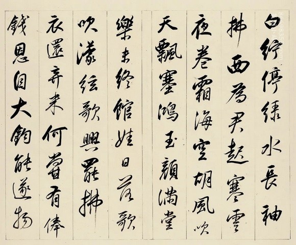 (六)白紵停绿水,长袖拂西爲君起。寒云夜卷霜海空,胡风吹天飘塞鸿。玉颜满堂乐未终,馆娃日落歌吹濛。弦歌兴罢拂衣还,弃米何尝有俸钱。恩自大钧能遂物,