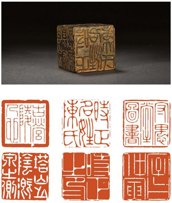 传世六面印实物较少。这种呈”凸”字形的印章,上面的印鼻有孔,可以穿带而佩,鼻端作一小印,连同其余五个印面故称六面印。