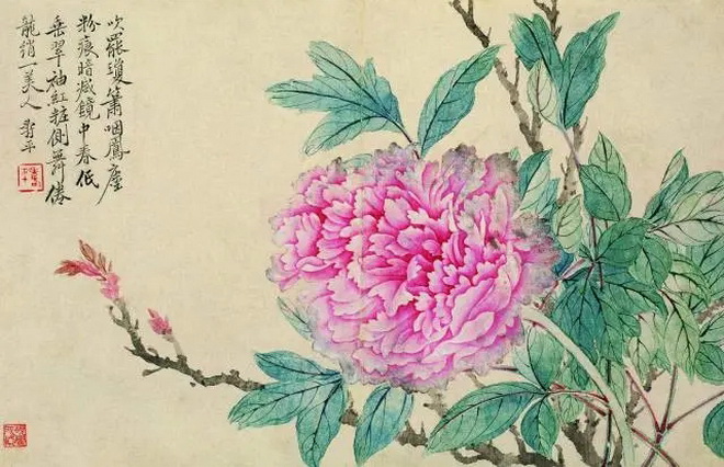此册五本花卉就反映了这一特色。其中桃花、腊梅、蝴蝶花纯运没骨法,和色彩渲染出花瓣形态轮廓和浓淡深浅,再勾点出花蕊和花托;牡丹、月季、绣球则用极淡的色线或墨线轻勾轮廓,再以色彩细致晕染;花叶亦以没骨显外形,线勾见筋脉。用色甚轻淡、清雅,下笔极简逸、柔细,笔、墨、色融和一体,深传花卉自然卓约之姿,将设色没骨法推进到了一个新的高度。其出色的创新成就,诚如至友王石谷在恽寿平《国香春霁图轴》题跋中所评:“北宋徐崇嗣创制没骨花,远宗僧繇,傅染之妙,一变黄筌勾勒之工,盖不用墨笔,以彩色染成,阴阳向背,曲尽其态,超于法外,合于自然,写生之极致也。南田子拟议神明,真能得造化之意,近世无与敌者。”