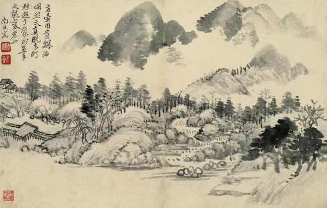 此页仿方从义的“云山图”,水墨滋润,运锋园润,深得方氏兼宗米芾、董源的画法之长。