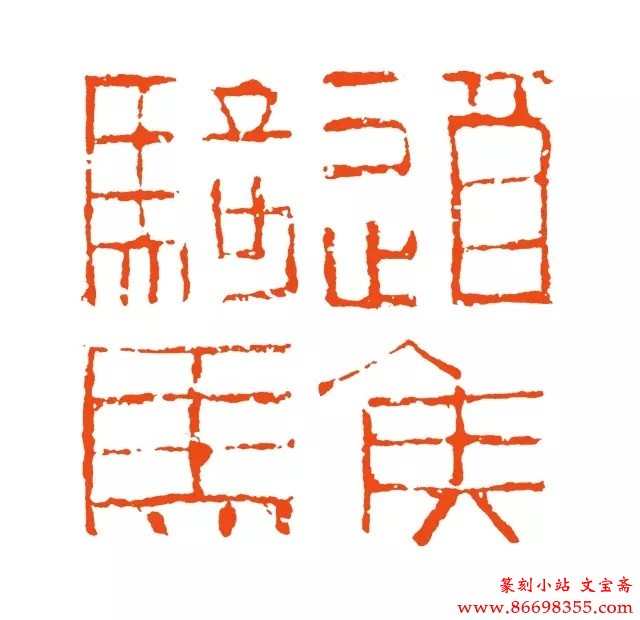 此印是汉代烙马印,形体大,字腔深,作朱文。无边朱文印很容易刻得松散凌乱,要刻得凝聚而活泼不容易,难点在于建立印面秩序。是印以横平竖直为本色,体现出鲜明的汉印特点。这在很大程度上也保证了印面稳定的秩序感。同时,凝聚的问题需要通过加强上下左右文字的联系来完成。如“骑”字曲笔的右伸,“侯”字斜笔的左伸,“遒”字“止”部的加重下沉,“马”字横画的虚化,这些因素的相互作用很好地增加了印面的凝聚感。最后适当的斜笔和圆点的使用使得印面摆脱了横平竖直可能带来的僵硬死板,增加了印面在秩序惑、凝聚感之外的活泼感。