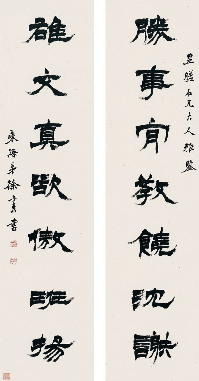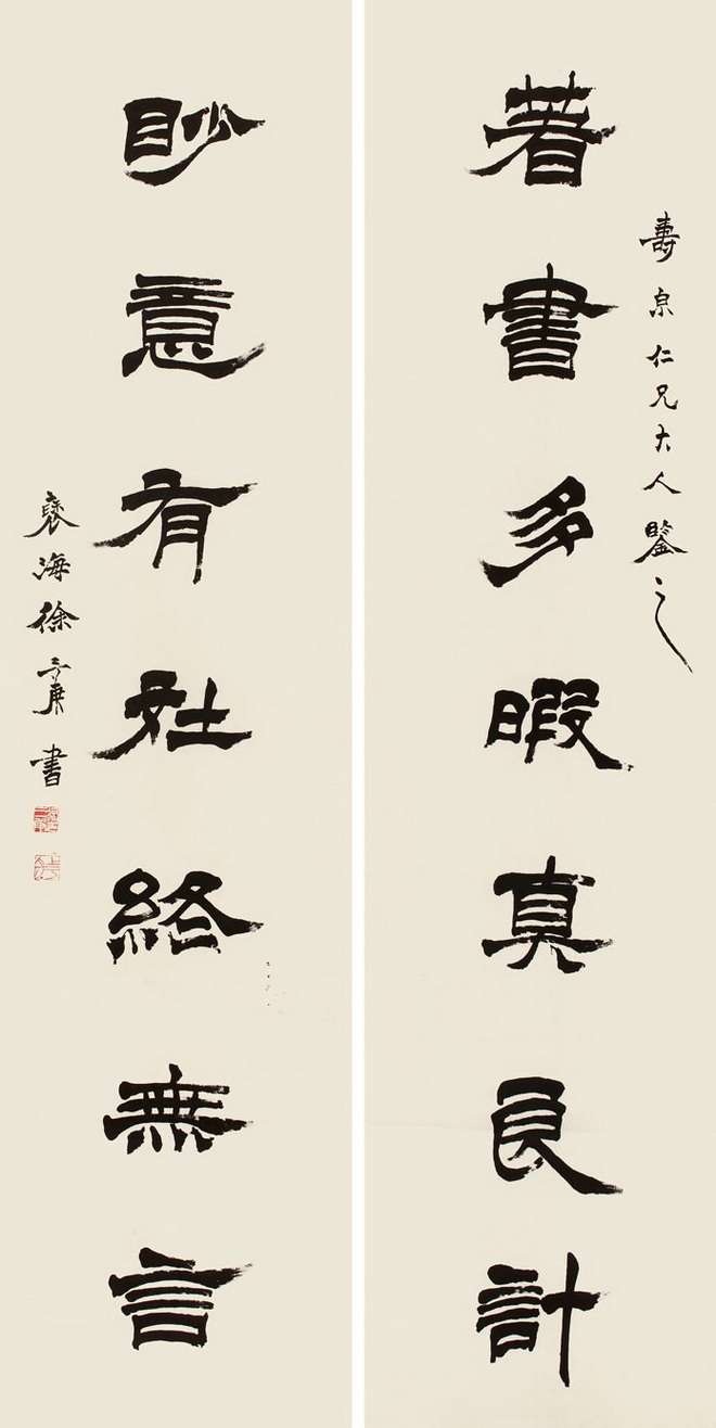 徐三庚工书法,遍习秦汉诸碑,各体皆能,尤善篆隶,书法多取法三国时的天发神谶碑,字形较多方扁形,独具面目。此隶书对联多用天发神谶笔意,奇瑰劲涩。