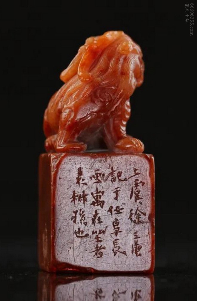 清末,徐三庚刻寿山红芙蓉石兽白文印钮章,印文:炳华私印,印面尺寸:2.6×2.6厘米,高6厘米,中国嘉德2018年秋季拍卖会,神秀天成—华郦馆藏寿山石雕艺术臻品,成交价17.825万元。