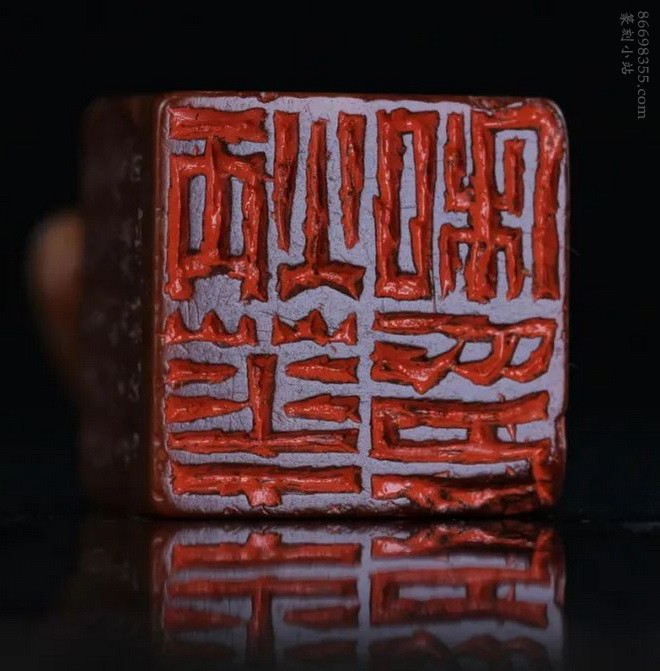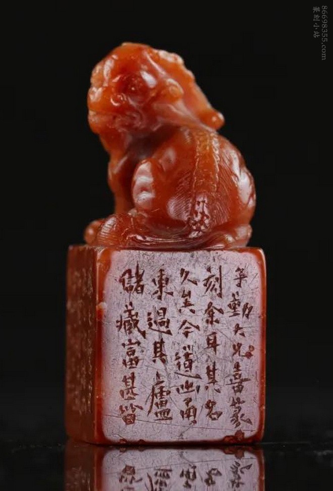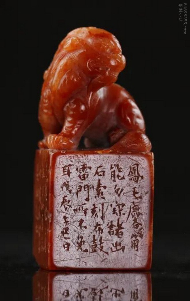此章通体呈酒红之色,质凝如蜡,美艳夺目而不失沉稳,有富贵高雅之致。钮雕一古兽后身蹲地,前身双足撑立,作回首状,雕工古拙有生气。