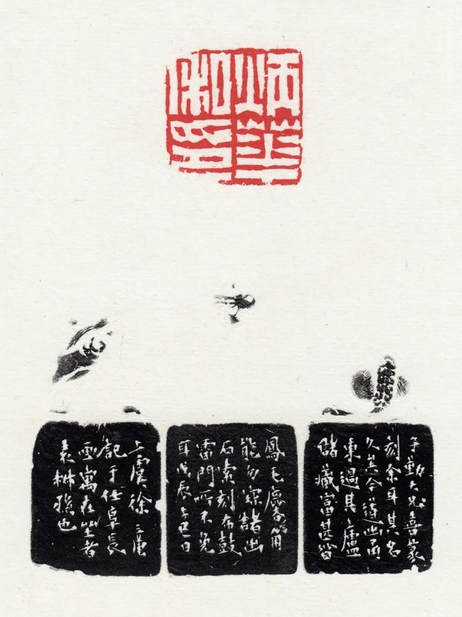 边款:子勤大兄喜篆刻,余耳其名久矣,今道出甬东,过其庐,储藏富甚,皆凤毛麐角,能勿宝诸。出石索刻,布鼓雷门所不免耳。戊辰上巳日上虞徐三庚记于任阜长画寓,在坐者袁椒孙也。