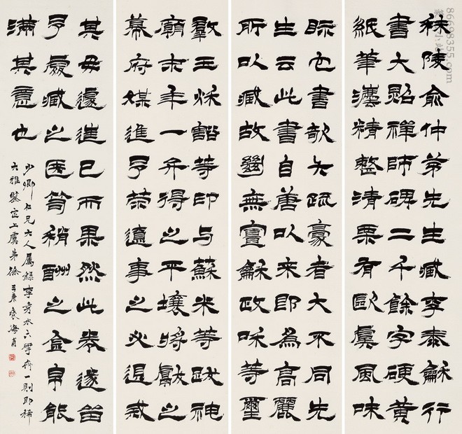 徐三庚以一种极为自由的书写状态创作此四屏。篆刻大家以刀作笔,笔划起处或直入或逆锋,中间涩行摆动如刀于石上行,收结处作左挑右磔,中宫收紧,呈刚柔相济之态。将书写和篆刻之刀法相融合的线条流丽而婉转,沉实而古雅,使其书写状态不为俗累、不为形役、不为物蔽,可谓“妙不可言”。孙过庭《书谱》说:“隶欲精而密……然后凛之以风神,温之以妍润,鼓之以枯劲,和之以闲雅。故可达其情性,形其哀乐。”徐三庚此四屏隶书不仅沉雄方厚,而且血肉丰满,婉转圆通,精美绝伦。