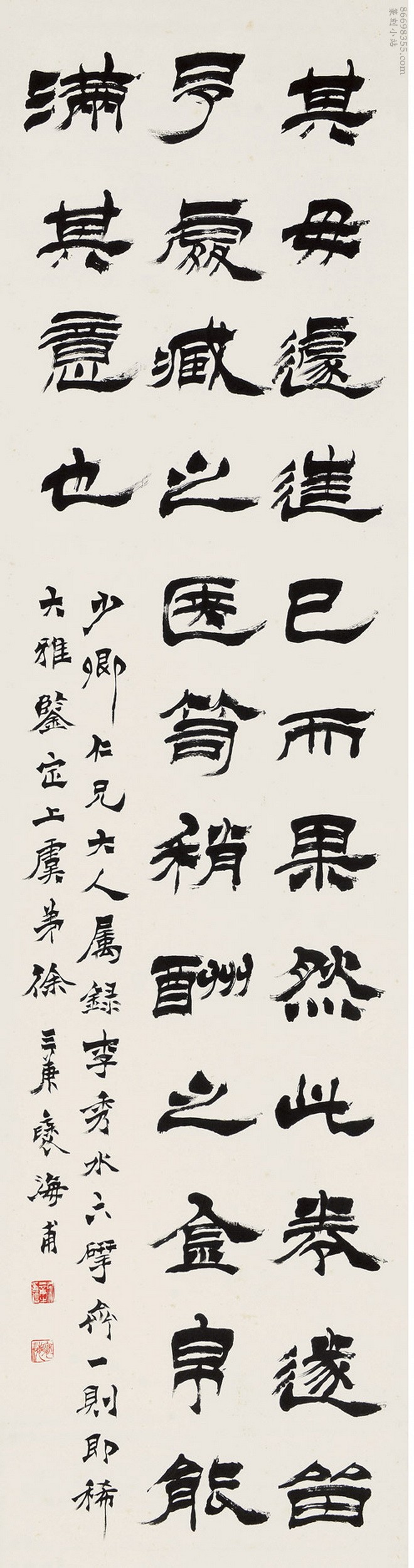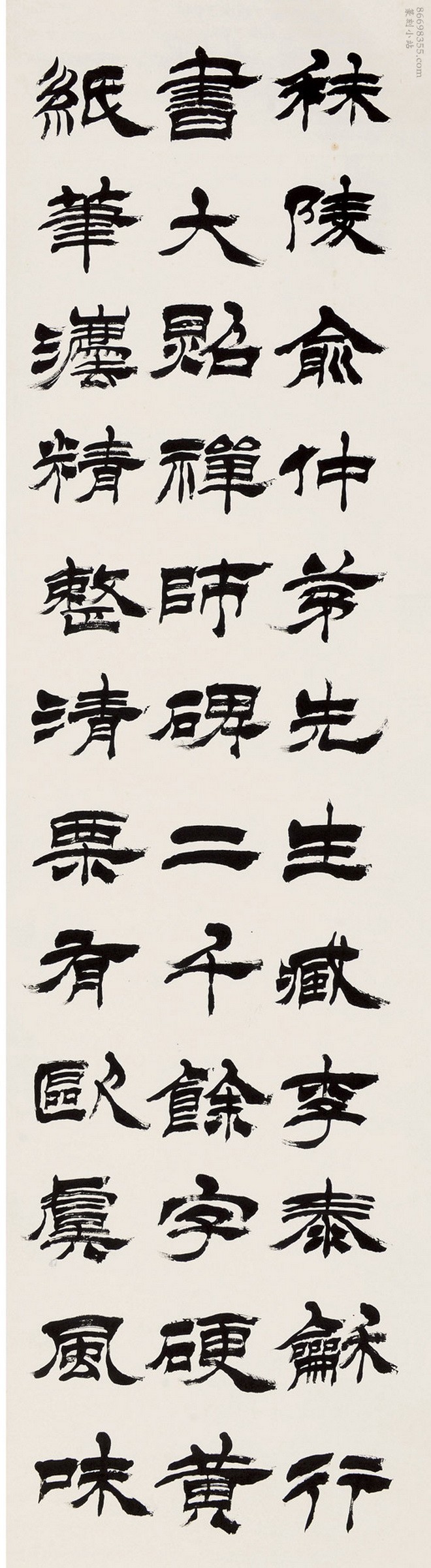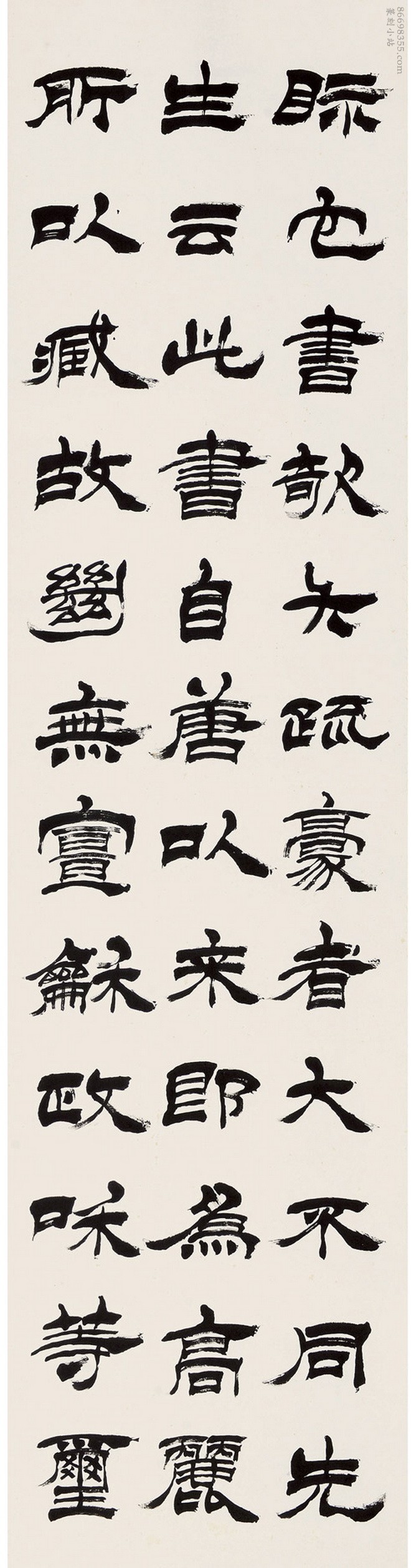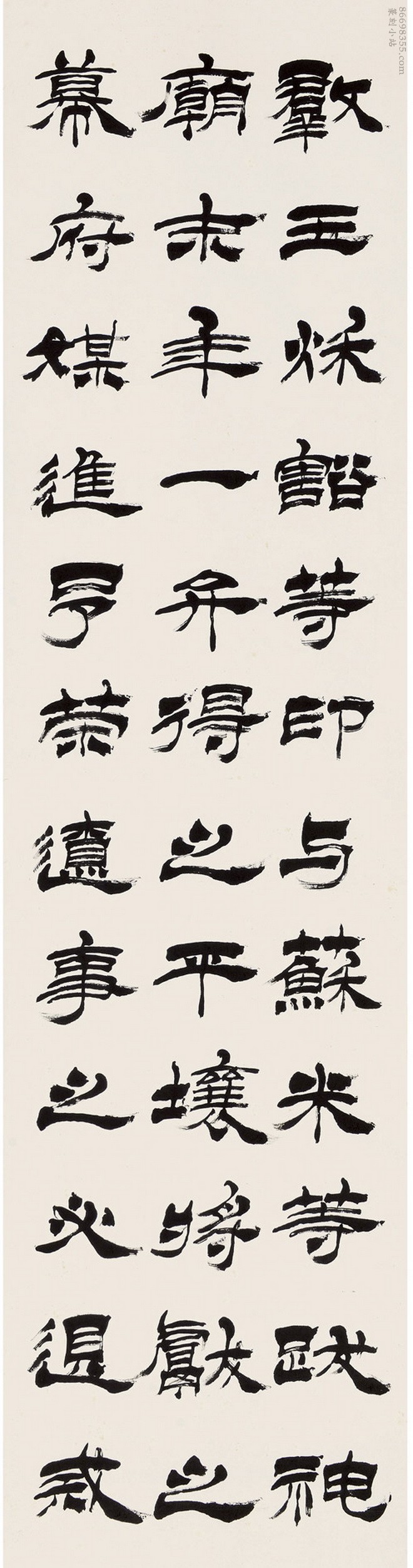 徐三庚(1826-1890) 隶书节录《李日华<味水轩日记>一则》四屏,水墨纸本,尺寸:178×47cm×4。此作徐三庚为“少卿尊兄大人”隶书节录《李日华<味水轩日记>一则》四屏,与杭州市博物馆藏其壬午年(1882)“要使、同驾”《隶书七言联》、以及私藏辛巳年所作“道识、风标”《隶书八言联》相较,可知此作为其晚年所书,取法于汉《礼器》、吴《天发神谶碑》,又融合金农隶法,于秀美遒劲、飘逸刚强中凸显自然老辣,浑厚苍莽。是作用笔中锋劲健厚实,侧锋妍丽洒脱;结字虚实相间,节律分明,横抹竖挑,加之线条间的摇摆变幻,宛如音符跳宕游走。