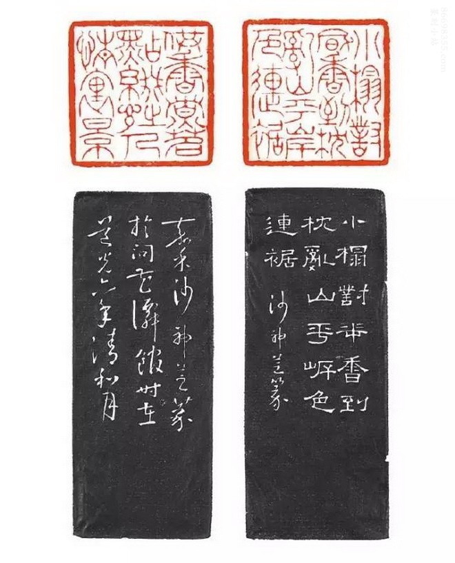 印文:1.供香鬻茗点缀之心人情里景。2.小榻对凤香到枕乱山平岸色连裾。