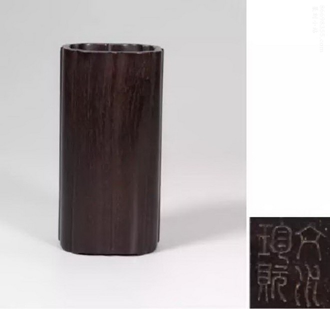 此件笔筒以紫檀为料,一木整挖。雕为花口,费工费料,实属难得。底部刻有文水珍玩的款识。整体造型干净利落,素雅精致,为文房把玩之佳品。