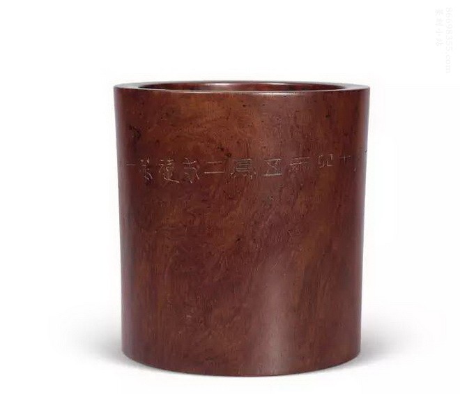 取材自黄花梨木,圆筒形,敞口平足,直壁较厚,以特有的自然纹理取胜,木纹微妙如晕染开的点点水墨。筒壁上阴刻诗文。整器造型端庄规整,简约雅致,展现黄花梨瑰丽气质,又饱含文雅书卷气,久经摩玩承传,使笔筒表面生成了自然的包浆,苍润坚凝,历史气息浓郁,不失为一件文房佳作。