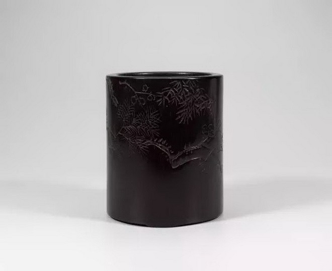 笔筒取紫檀为材,整挖而成,呈直筒式。其造型庄重沉稳,下承三小足。筒壁用阴刻技法剔刻松竹梅,松树郁郁葱葱,精神抖擞,竹影婆娑清气满庭,梅花笑傲、严寒破蕊怒放,映照了刻文岁寒三友图。整器做工精细,包浆温润,木纹清晰可见,文雅大方,宜文房陈设。