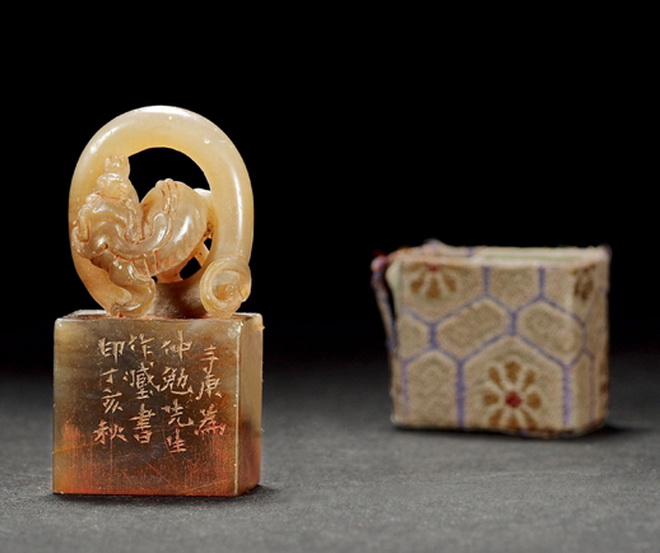 徐三庚1887年作,寿山牛角冻,单螭穿环钮龚心钊印,印文:龚氏藏书;印面尺寸:2.3×1.5厘米,高4.6厘米, 西泠印社2020年秋季拍卖会,文房清玩近现代名家篆刻专场,成交价格:29.9万。